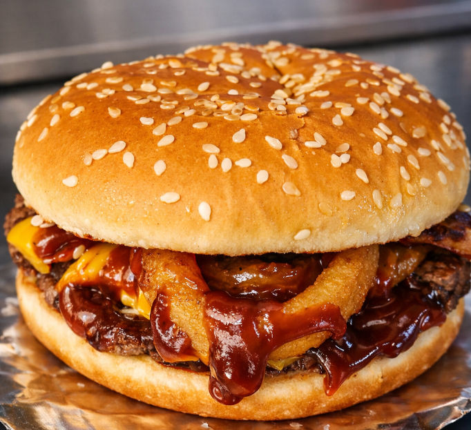 Juicy beef patty topped with melted cheddar, crispy onion rings, and smoky BBQ sauce on a toasted sesame bun—big flavor in every bite.